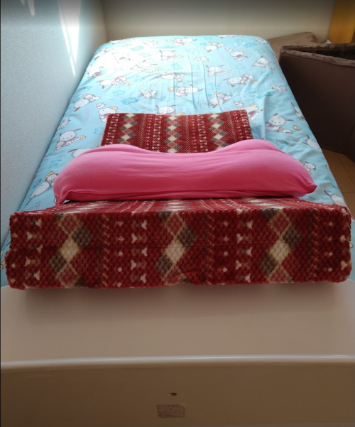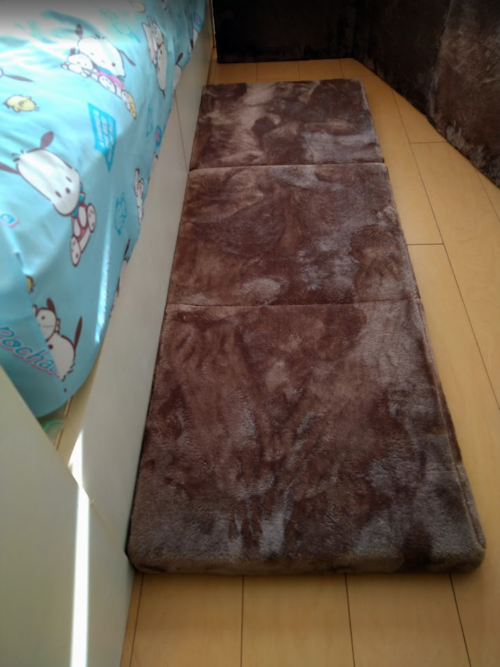・フロアクッションを2つ折りにしてベッドのヘッド(頭)のフチに立てかけてみました。
