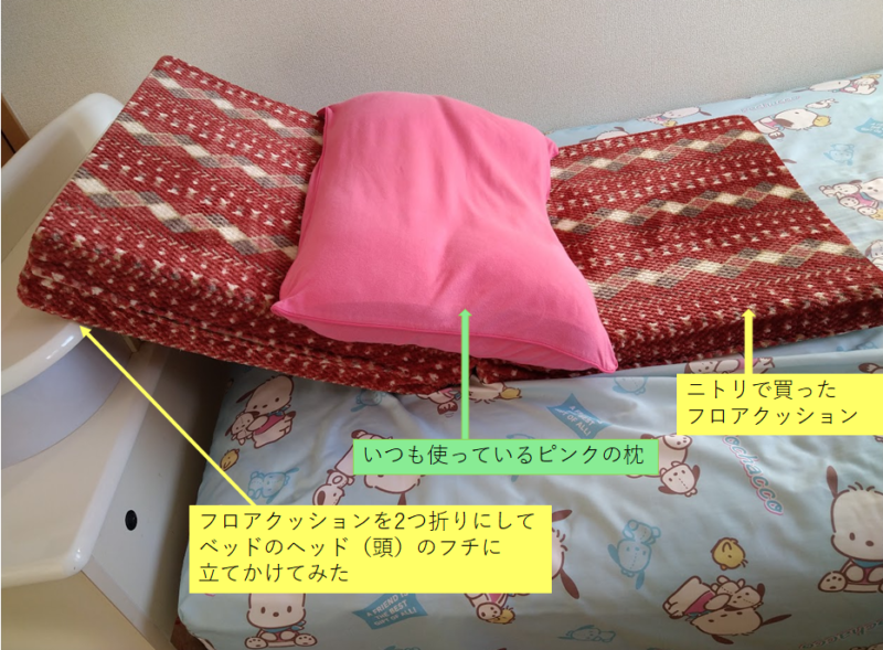 ・フロアクッションだけだと、なんかかたくて首とか肩の周辺あたりが痛かった為、クッションの上にいつも使っている枕を置いてみました。